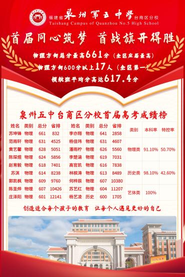 【喜报】巧思驭机,智创未来——泉州五中台商区分校学子在第八届泉州市青少年机器人竞赛中喜获佳绩! 11-24 【喜报】探求科学世界,感受光影魅力——泉州五中台商区分校学子荣获2025年福建省青少年科学影像节二等奖 11-24 【喜报】省赛夺魁!我校化学组郭妙莉老师荣膺实验教学省一等奖 11-23 【喜报】深耕沃土 芬芳自来——我校洪玲凤老师入选“福建省2025年乡村优秀青年教师培养支持计划” 11-23 【喜报】国赛争光!泉州五中台商区分校初中学子勇夺世界机器人大会青少年设计大赛国家级奖项! 11-22 【喜报】活力绽放,荣光闪耀!泉州五中台商区分校啦啦操队在市赛中斩获佳绩! 11-11 【喜报】泉州五中台商区分校在2024-2025年区中小学生运动会勇夺初中组团体总分冠军!高中组团体总分殿军! 11-11 【喜报】载誉归来!泉州五中台商区分校五祖拳队伍市赛“打”出佳绩,一举冲进全市前三! 11-03